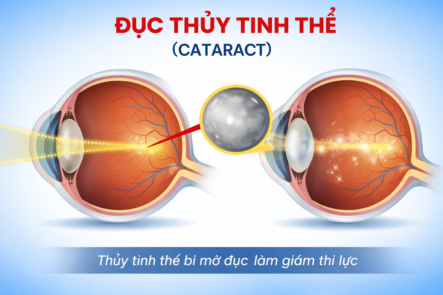 Đục thủy tinh thể (Cataract) là tình trạng thủy tinh thể trong mắt bị mờ đục, làm ánh sáng không thể đi vào võng mạc một cách rõ ràng, từ đó gây giảm thị lực.